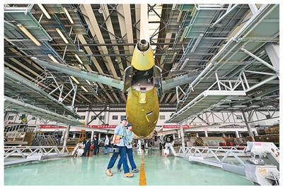 正在天津商业试验区天津机场片区内的天津海特飞机工程无限公司,工做人员正在机库内对飞机进行保税维修。记者 孙凡越摄。