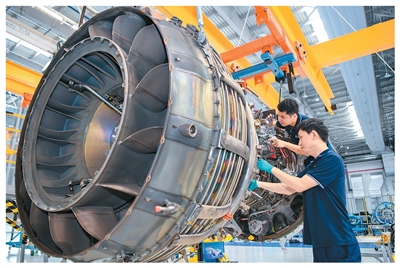 正在海南海口空港分析保税区内,海口美兰空港吉耐斯航空策动机维修工程无限公司工做人员正对一台航空策动机进行细密“体检”,为后续维修工做做预备。苏弼坤摄(人平易近视觉)。